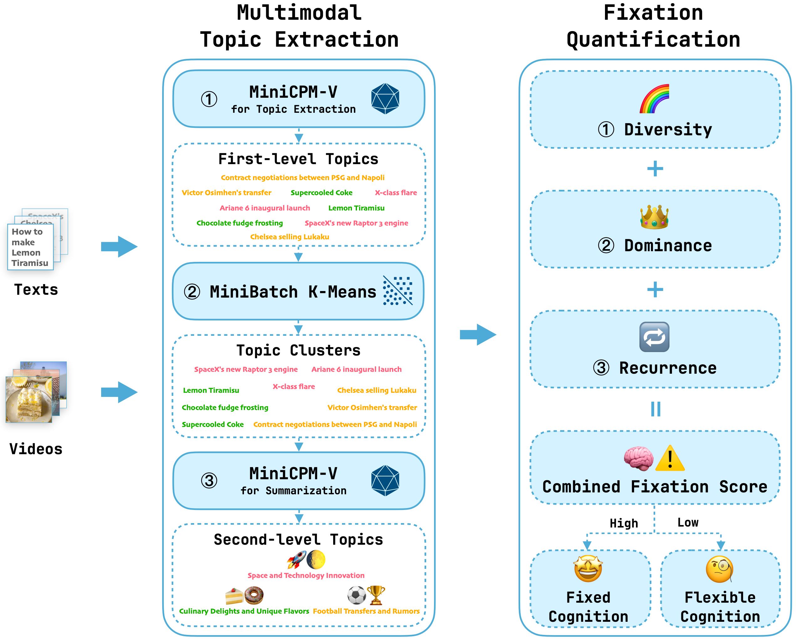 Digital social media platforms frequently contribute to cognitive-behavioral fixation, a phenomenon in which users exhibit sustained and repetitive engagement with narrow content domains. While cognitive-behavioral fixation has been extensively studied in psychology, methods for computationally detecting and evaluating such fixation remain underexplored. To address this gap, we propose a novel framework for assessing cognitive-behavioral fixation by analyzing users' multimodal social media engagement patterns. Specifically, we introduce a multimodal topic extraction module and a cognitive-behavioral fixation quantification module that collaboratively enable adaptive, hierarchical, and interpretable assessment of user behavior. Experiments on existing benchmarks and a newly curated multimodal dataset demonstrate the effectiveness of our approach, laying the groundwork for scalable computational analysis of cognitive fixation. All code in this project is publicly available for research purposes at https://github.com/Liskie/cognitive-fixation-evaluation.