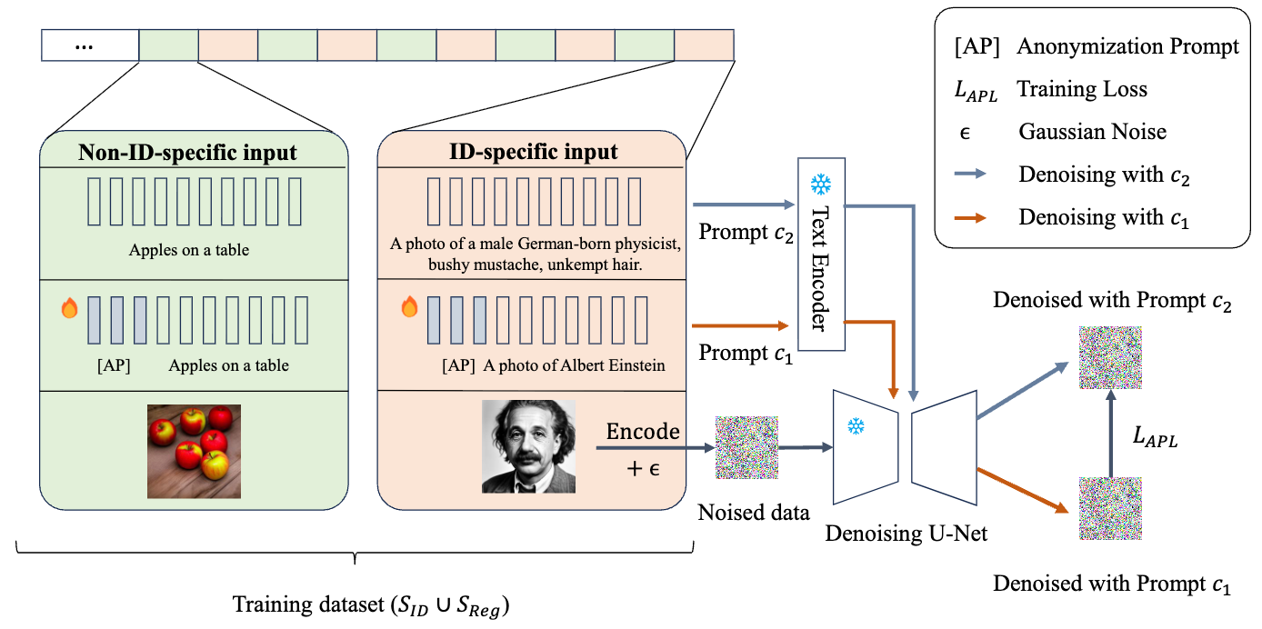 Specifically, we introduce a learnable prompt prefix, referred to as the Anonymization Prompt (AP), into the text input of text-to-image diffusion models. With the diffusion model parameters kept frozen, APL optimizes only the anonymization prompt so that the model generates identity-mismatched facial images when given prompts containing specific person identities, while preserving alignment with corresponding facial attribute descriptions. Furthermore, a regularization mechanism ensures that the anonymization prompt remains ineffective for prompts without identity-specific information, thereby preserving the model’s original image generation capability.