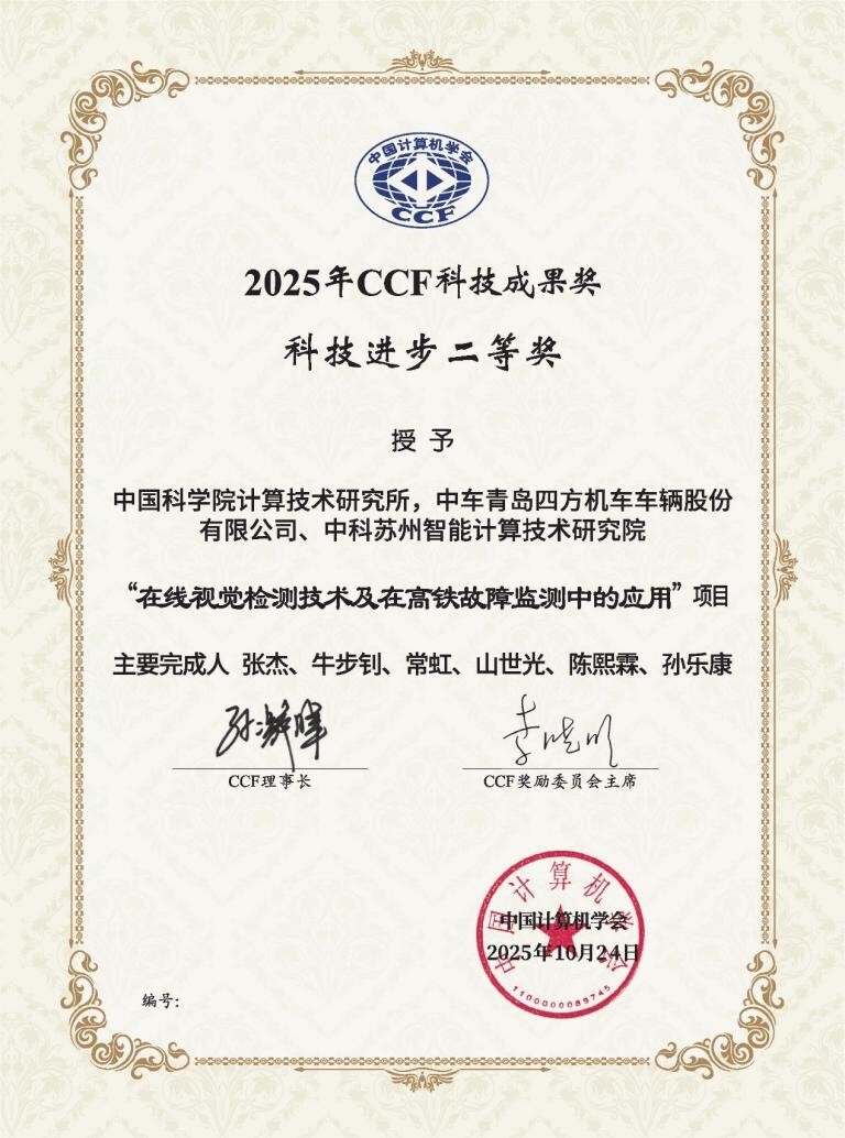 2025年10月24日,在中国计算机学会(CCF)主办的2025中国计算机大会(CNCC 2025)颁奖典礼上,正式揭晓了2025年度“CCF科技成果奖”评选结果,由实验室(中国科学院计算技术研究所)、中车青岛四方机车车辆股份有限公司、中科苏州智能计算技术研究院共同完成的“在线视觉检测技术及在高铁故障监测中的应用”荣获科技成果奖(科技进步二等奖)。